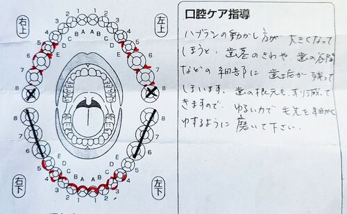 こんにちは。歯医者さんで歯石を取ってもらってスッキリしたばなおです。今日施術後にいただいた口腔ケア指導の文書がこちらです。 黒線は歯がありません。赤く塗られた箇所は歯石か歯垢です ■この記事でお伝えしたいこと・わたしみたいに歯が少なくなって生…
